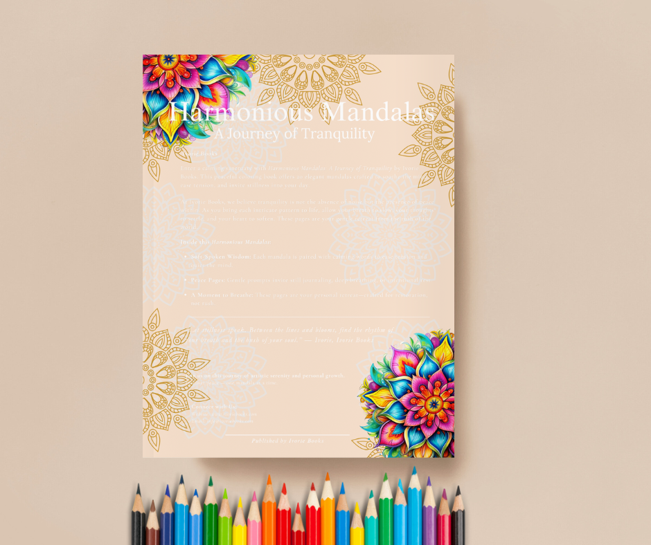 Harmonious Mandalas: A Journey of Tranquility is your creative refuge from the noise of everyday life. With soothing designs, peaceful affirmations, and quiet journaling space, this edition is a sanctuary of stillness—designed to help you slow down, breathe deeply, and restore inner balance.